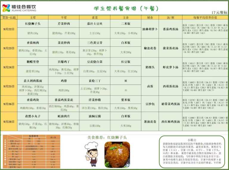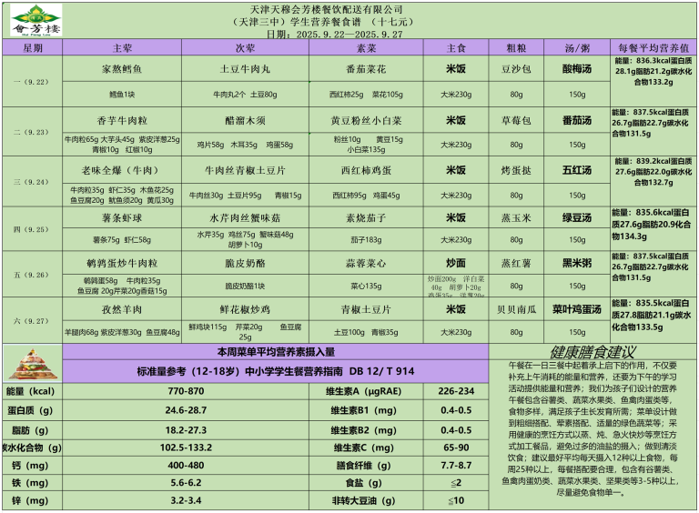 天津市第三中学学生营养餐食谱(2025.9.22-2025.9.28)