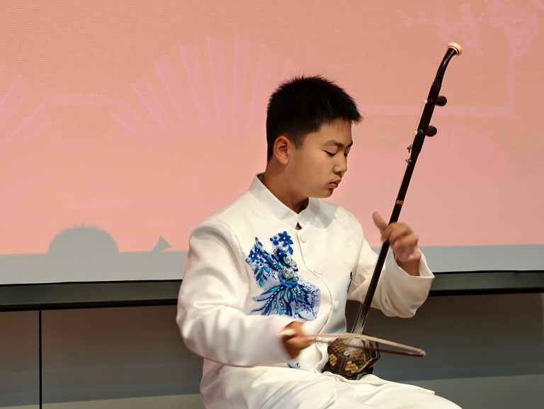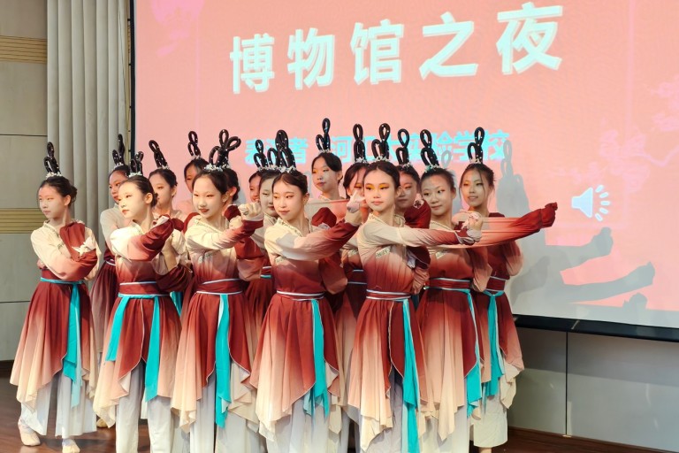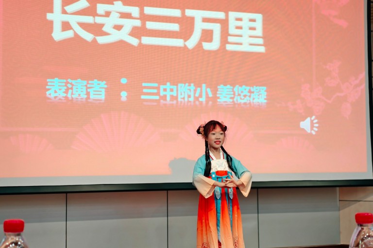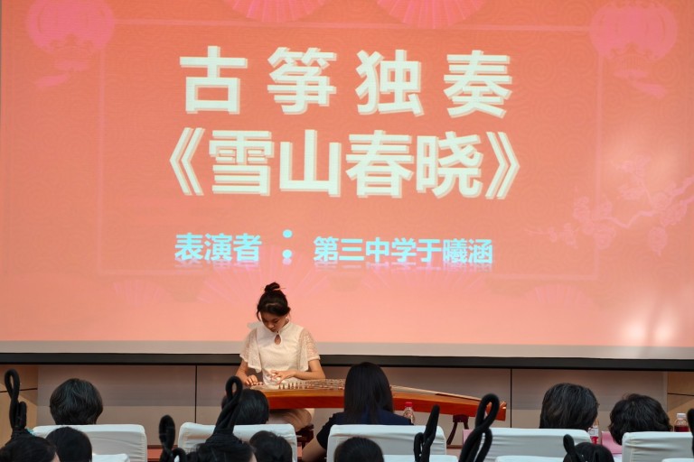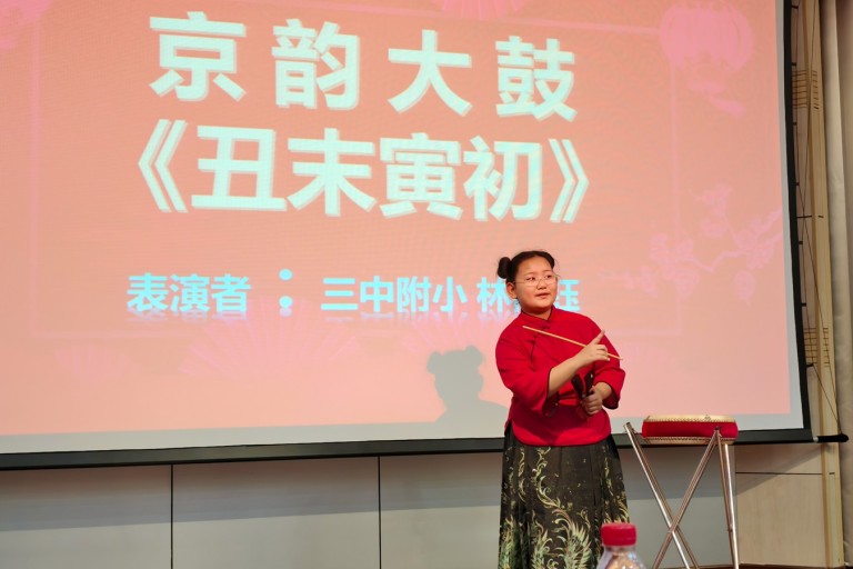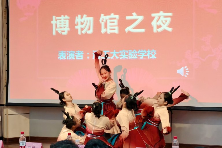 演出环节精彩纷呈,各校师生轮番登台,展现了深厚的艺术素养和青春活力。三中东校区的古筝独奏悠扬典雅,第七幼儿园小朋友的架子鼓表演《星光闪闪》充满童真与力量,三中附小的舞蹈《长安三万里》与京韵大鼓相继登场,赢得阵阵掌声。河工大附中的舞蹈《博物馆之夜》以及西青道中学的二胡独奏《豫乡行》也各具特色,为观众带来一场视听盛宴。