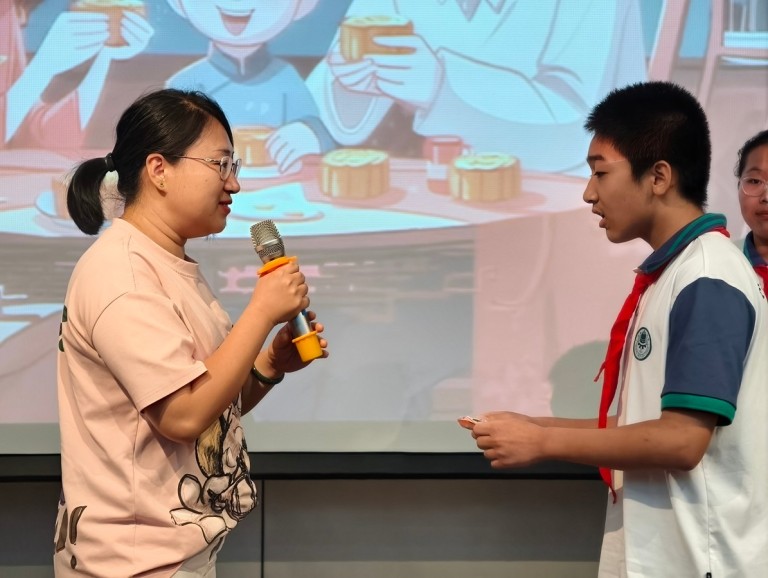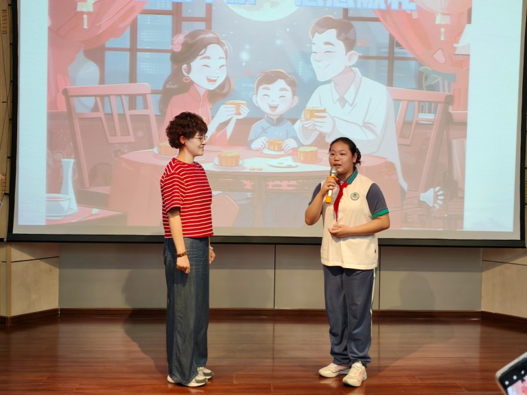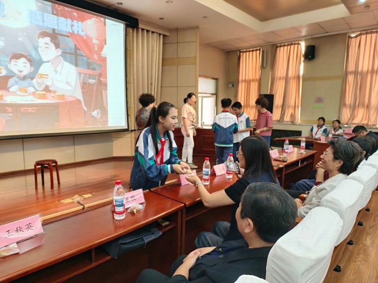 活动中还设置了丰富有趣的互动环节。“中秋诗词对对碰”和“有奖问答”点燃了全场的参与热情,同学们踊跃抢答,在游戏中重温中秋习俗与经典诗句。随后的“情暖中秋:感恩献礼”环节中,孩子们将亲手准备的月饼送给父母和老师,表达感恩之情,场面温馨动人。
