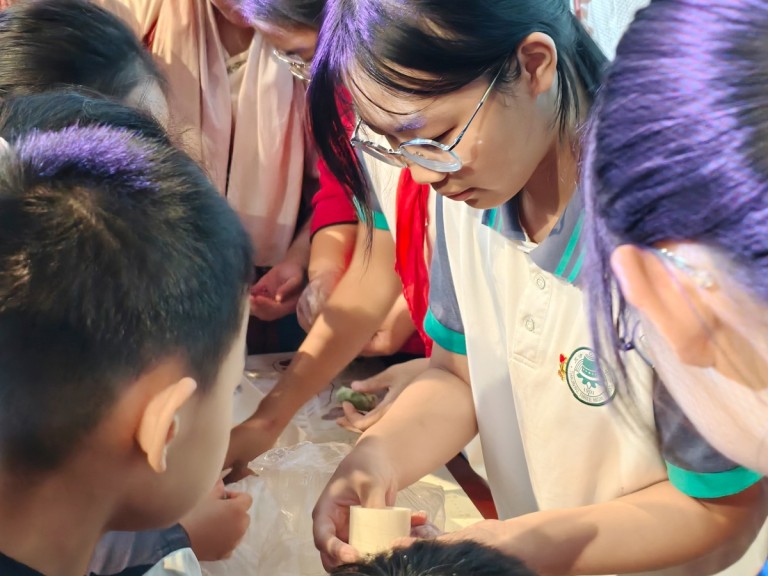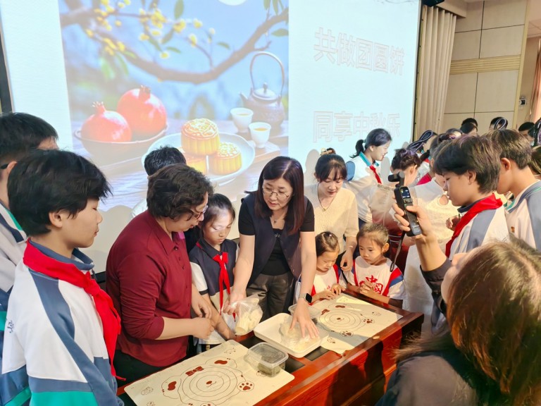 在“共做团圆饼,同享中秋乐”月饼DIY体验中,领导、老师、同学和家长们共同动手,揉面、包馅、压模,体验传统美食的制作乐趣。