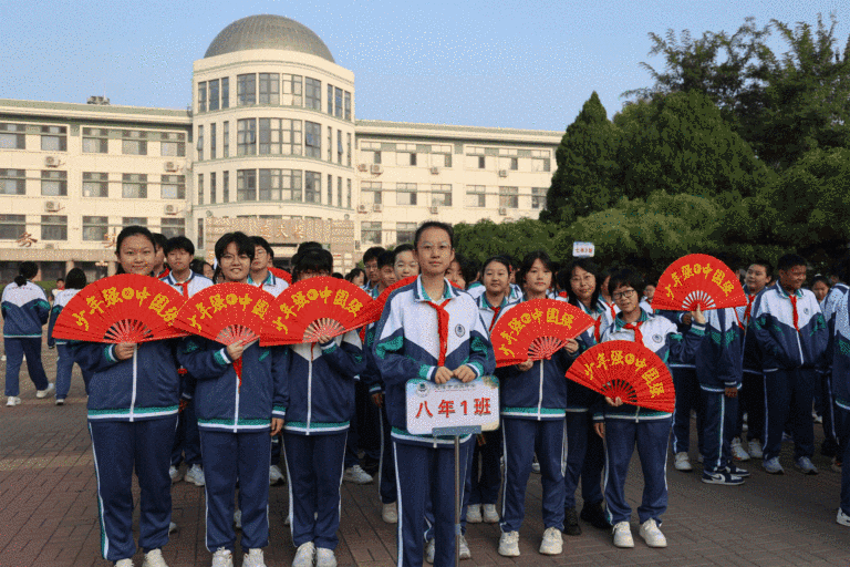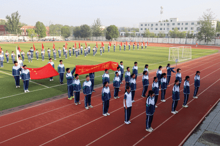 国旗护卫队率先登场,他们昂首阔步,手擎五星红旗稳步前行,鲜红的旗帜在秋风中猎猎飞扬,瞬间点燃了全场的爱国热情。校旗方阵气宇轩昂,花束队伍活力四射,高二 1 班、2 班组成的红旗方阵同步挥舞,红浪翻滚间,尽显青春的蓬勃力量。