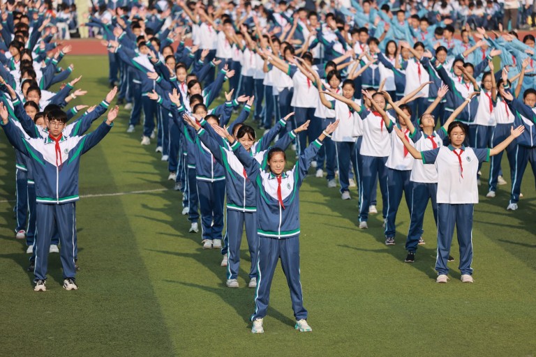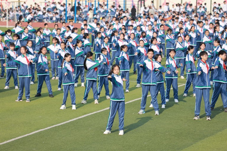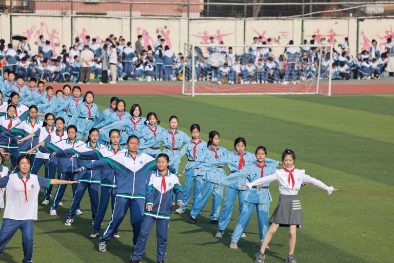 七年级学生代表带来广播体操表演,抬手、踢腿、转身,动作标准整齐,队列变换如行云流水,展现了日常体育锻炼的扎实成果。
