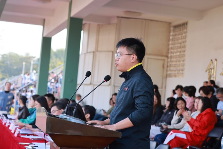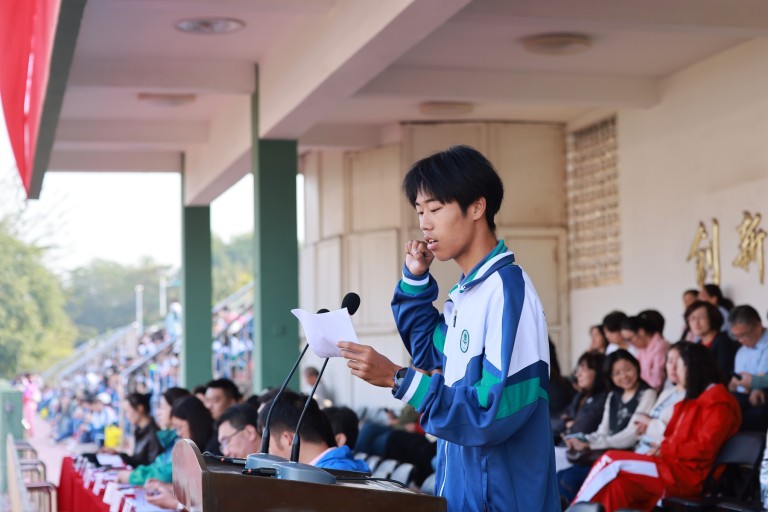 高一 5 班赵绪阳同学作为运动员代表,郑重宣誓,承诺将秉持公平竞争的原则,全力以赴,赛出风格,赛出水平。