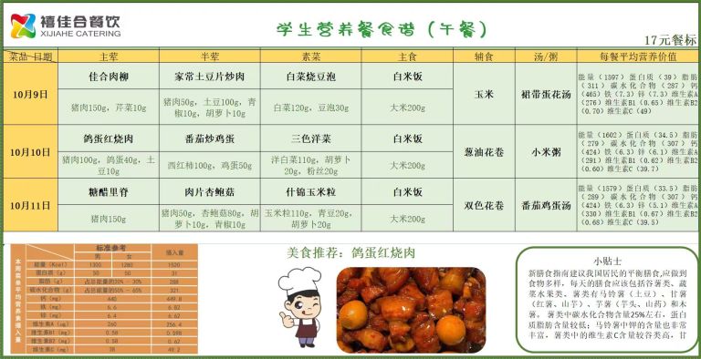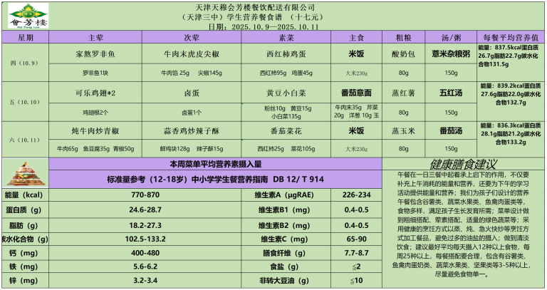 天津市第三中学学生营养餐食谱(2025.10.9-2025.10.11)