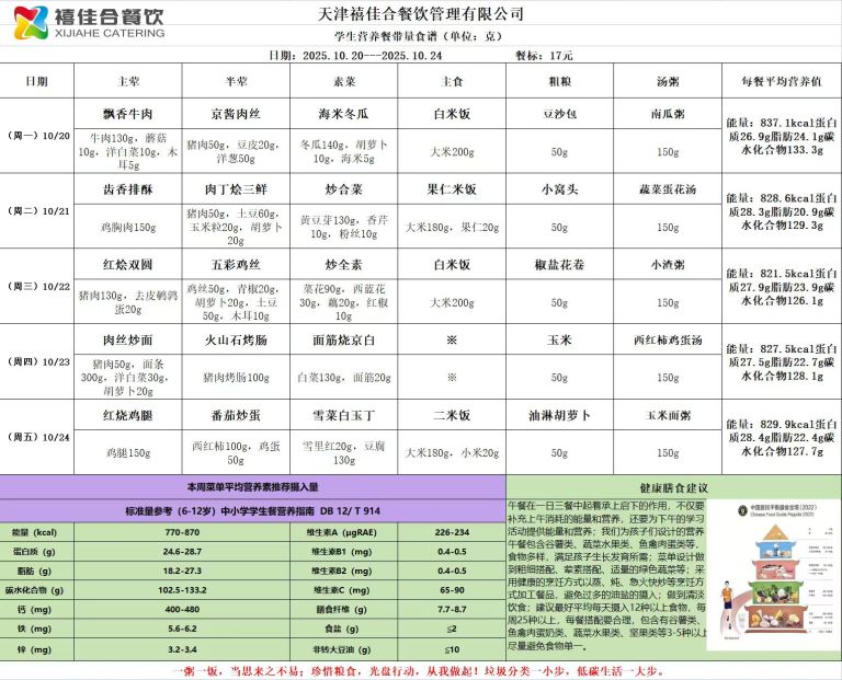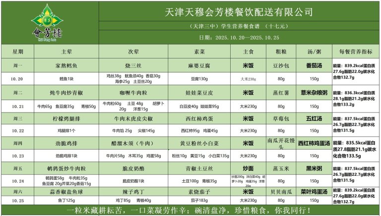 天津市第三中学学生营养餐食谱(2025.10.20-2025.10.25)