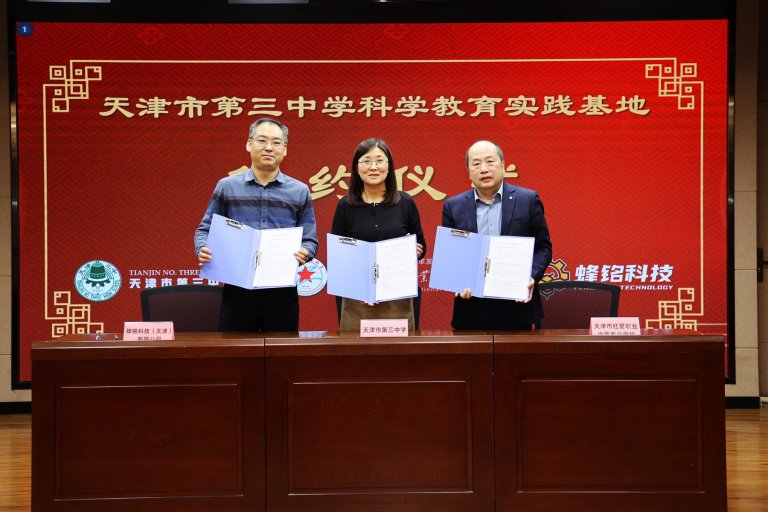 签约仪式在红星职专创造性劳动教育实践基地举行。天津市第三中学校长李娜、红星职专校长庄建军、蜂铭科技总经理朱晓利分别代表三方签署合作协议,并举行揭牌仪式,天津市第三中学科学教育实践基地正式成立。