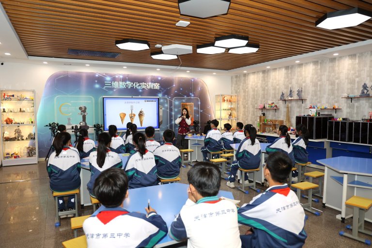 签约仪式后,首场天津市第三中学科学教育实践基地研学活动同步开启。在红星职专实训中心,蜂铭科技布置的无人机模拟、3D打印和AR虚拟仿真探索等三大板块引发了学生极大参与兴趣。