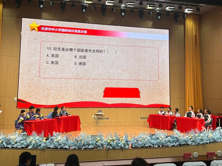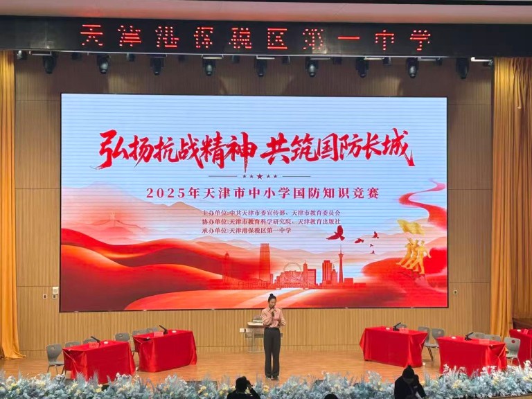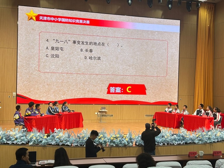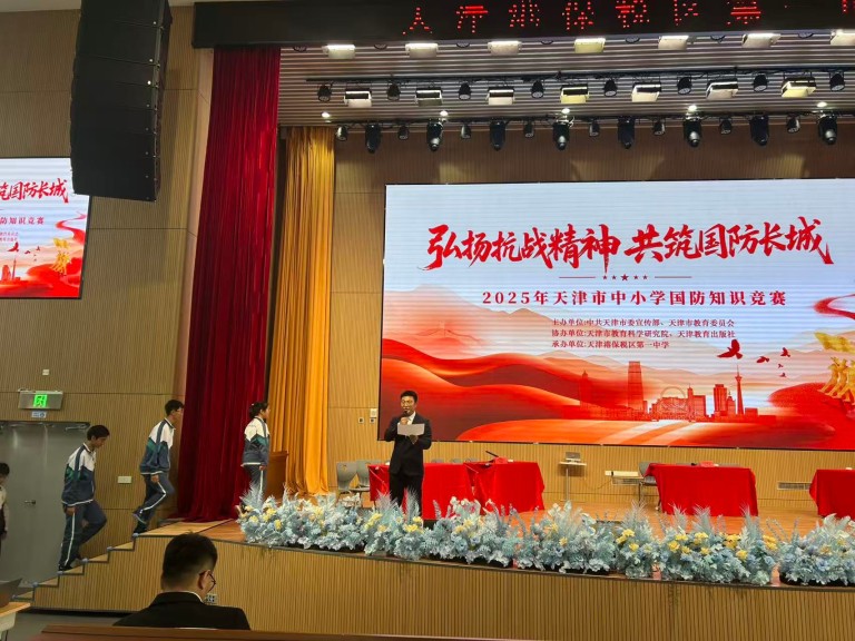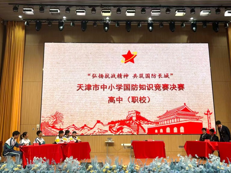 为厚植青少年国防情怀,传承伟大抗战精神,2025年10月25日,以 “弘扬抗战精神,共助国防长城” 为主题的天津市中小学国防知识竞赛在保税区第一中学顺利举办。本次竞赛覆盖小学、初中、高中三个学段,每个学段均有 16 支代表队同台比拼。我校派出两支队伍分别参与初中组与高中组的比拼,最终不负众望,斩获佳绩。