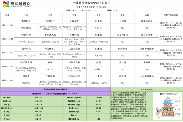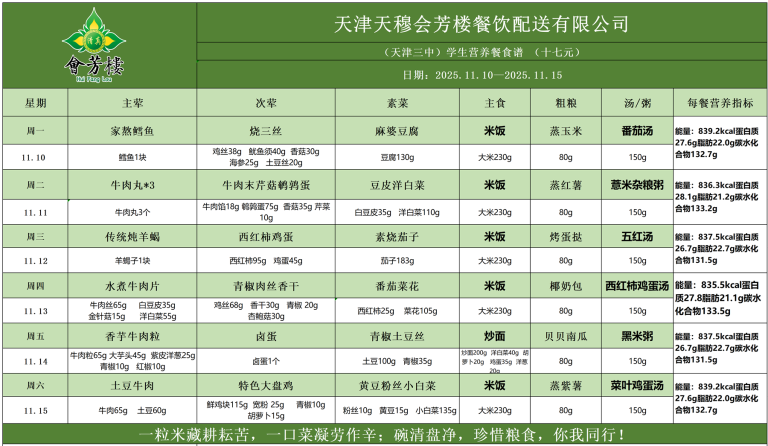 天津市第三中学学生营养餐食谱(2025.11.10-2025.11.15)