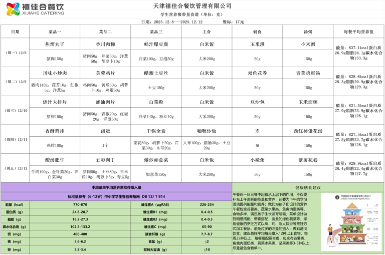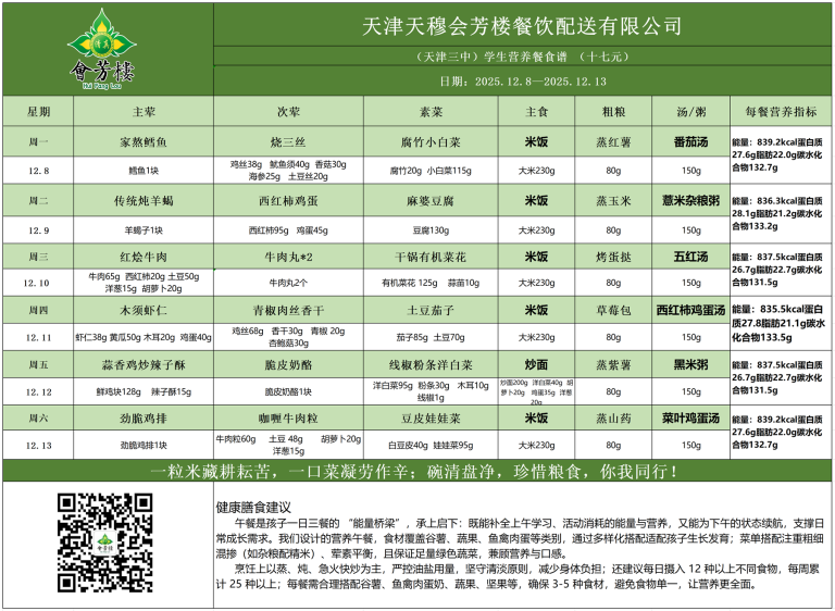 天津市第三中学学生营养餐食谱(2025.12.8-2025.12.13)