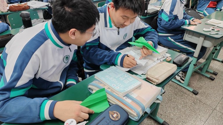 最受同学们欢迎的当属 “纸飞机压力环游记” 环节。大家将压力纸折叠成飞机,画上专属卡通标记后集体放飞。随后,同学们随机捡起他人的纸飞机,用不同颜色的笔写下事件的积极面;经过小组讨论,为飞机主人提供三条应对压力的办法或鼓励话语,再将纸飞机还原放飞,让每位同学都能找回自己的 “压力飞机”,品读同伴的暖心留言。这一环节不仅让同学们学会从积极视角看待压力事件,更在互助分享中收获了情感支持,感受到 “不是独自战斗” 的温暖。