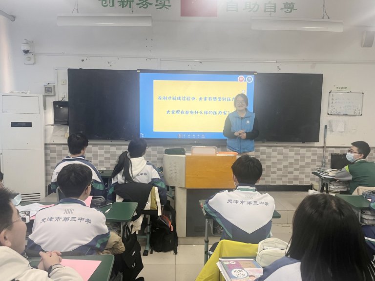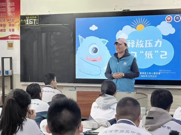 为帮助初三、高三学子缓解考前压力,以积极心态迎接人生重要挑战,2025 年 12 月 22 日,天津三中联合天津师范大学心理学部开展了主题为 “释放压力,放飞‘纸’己” 的心理团体辅导活动。整场活动以 “纸” 为核心载体,通过趣味互动与专业引导相结合的方式,让同学们在轻松氛围中学会觉察压力、接纳压力、管理压力。