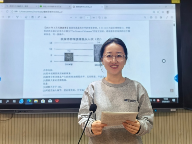 随后,靳峥、郭维维、王鸿艳、李维聪四位教师通过抽签确定顺序,依次对2025年高考阅读表达与写作部分进行题目解读与教学设计分享。四位教师基于扎实的数据分析和学情把握,从命题趋势、解题策略、教学重难点、学生常见问题等维度展开深入剖析,提出了富有针对性的备考建议与课堂实施路径。