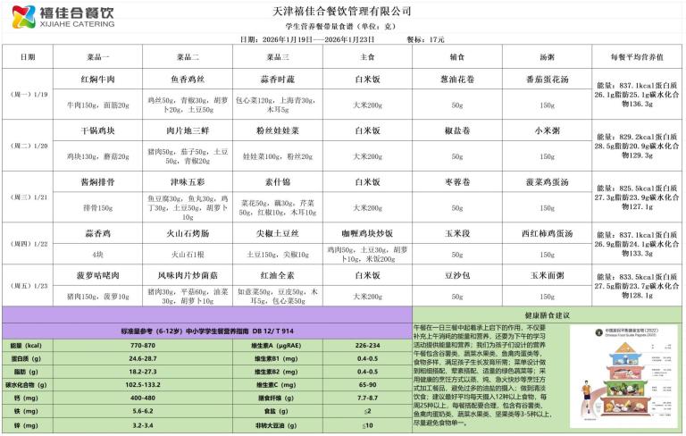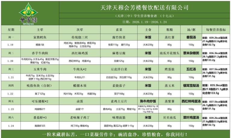 天津市第三中学学生营养餐食谱(2026.1.19-2026.1.24)