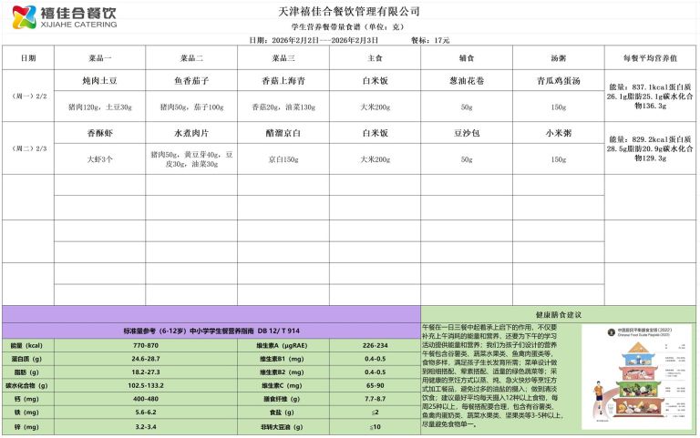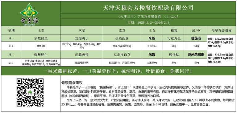 天津市第三中学学生营养餐食谱(2026.2.2-2026.2.3)