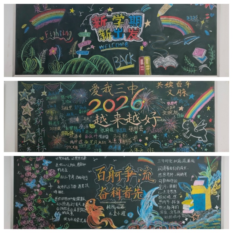 笔墨传情,板载初心。黑板报绘制活动中,同学们挥毫泼墨、巧思创意,以新学期愿景、文明礼仪、青春担当为主题,精心设计版面、书写赤诚心声,让一面面黑板报成为班级文化的缩影,传递青春正能量。