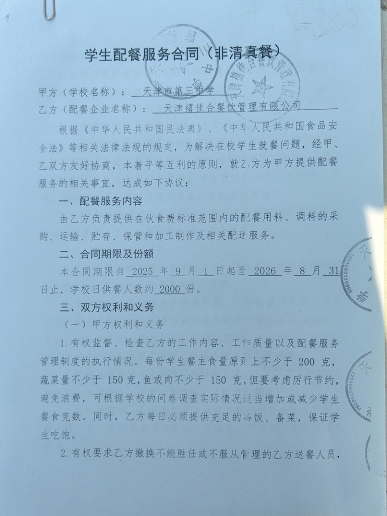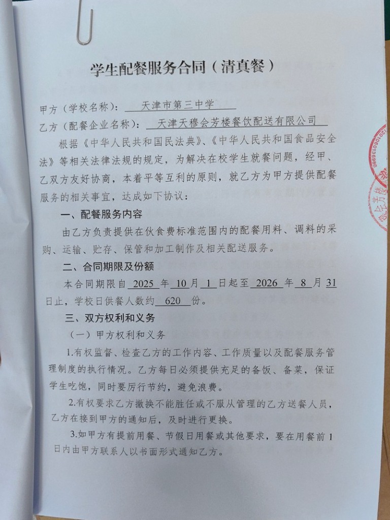 天津市第三中学2025-2026学年度学生校外配餐公司资质公示