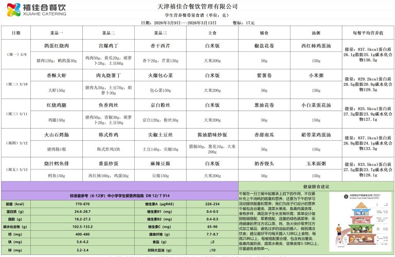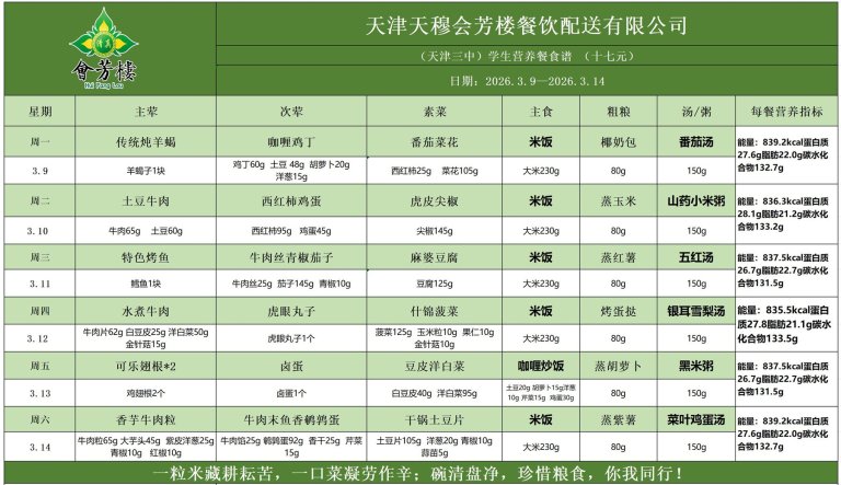 天津市第三中学学生营养餐食谱(2026.3.9-2026.3.14)