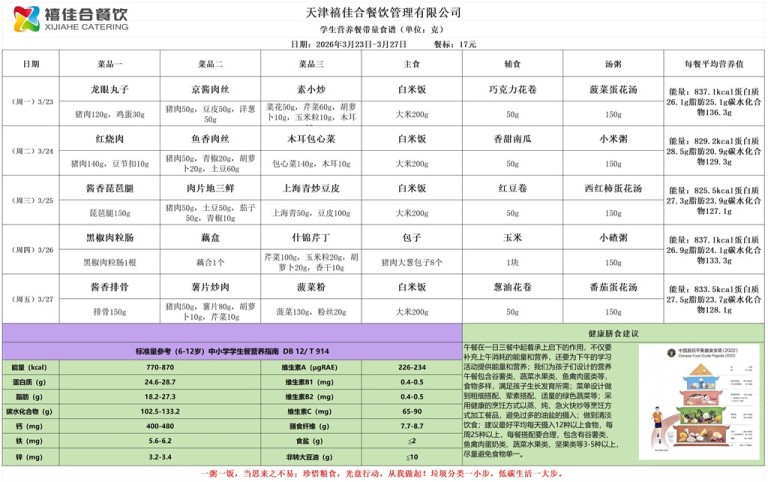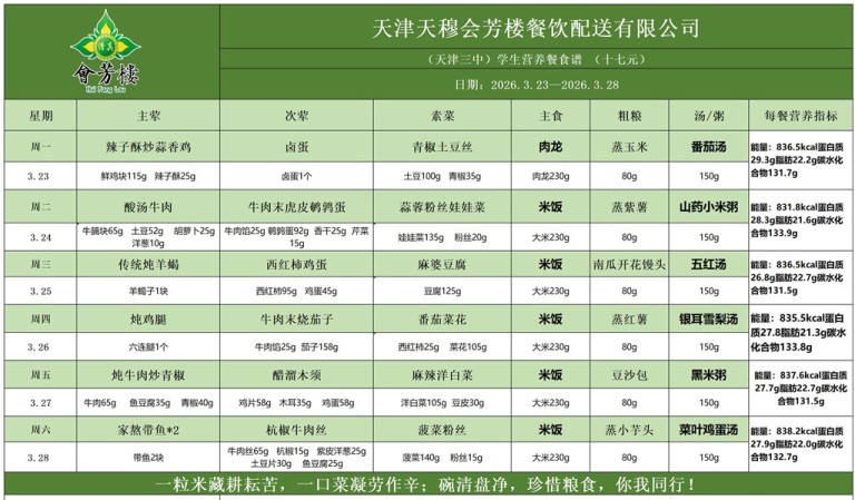天津市第三中学学生营养餐食谱(2026.3.23-2026.3.28)